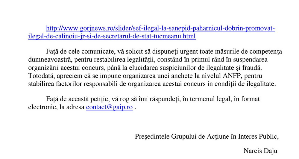 Aspectele ilegale probate de noi în anchetele de presă publicate aici și aici au fost sintetizate într-o petiție înaintată mai multor autorități ale statului, prin care am cerut blocarea concursului ilegal și adoptarea tuturor măsurilor necesare pentru restabilirea legalității.