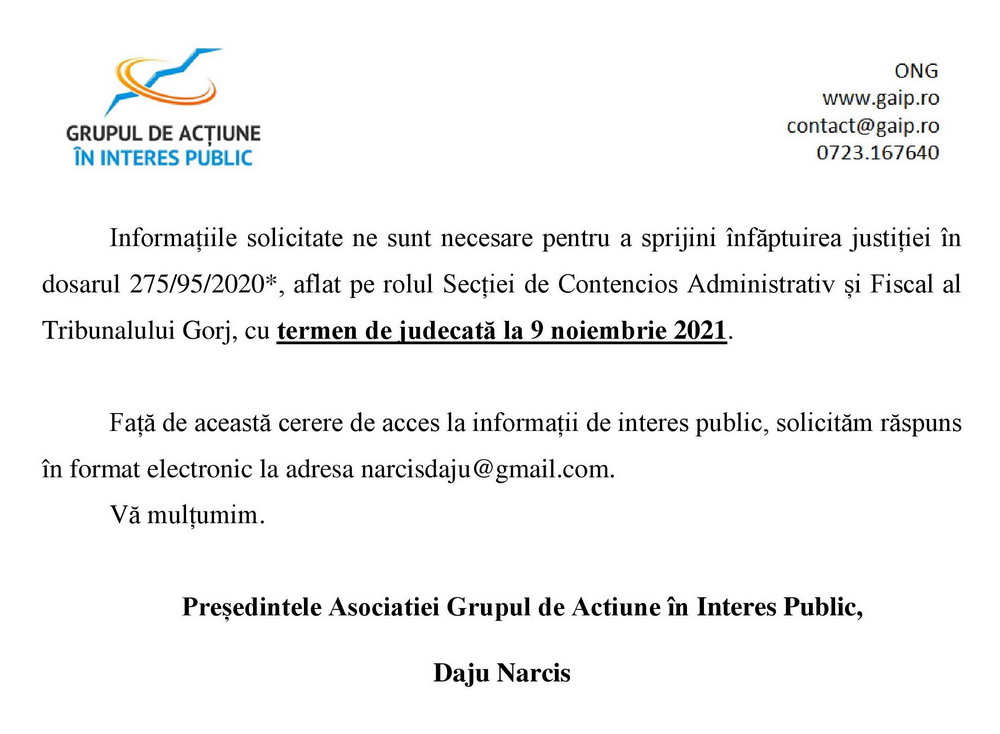 Pentru deplina edificare a distinșilor cititori, publicăm mai jos corespondența asociației cu IPJ-ul. Ce și cum am întrebat, despre dosarul penal, și cu câtă golănie ieftină ne-au răspuns șefii IPJ Gorj, în condițiile în care suntem denunțători în cauza penală, prin Asociația Grupul de Acțiune în Interes Public!!! Repet, documentele de mai jos existau, deja, în dosarul de la Tribunal, în care judecătoarea Berculescu n-a reușit să se uite, cel mai probabil pentru că i se comunicase, deja, pe un bilețel sau prin viu grai, hotărârea pe care, ca orice judecătoare aptă să plece cu vaca, era obligată să o pronunțe.